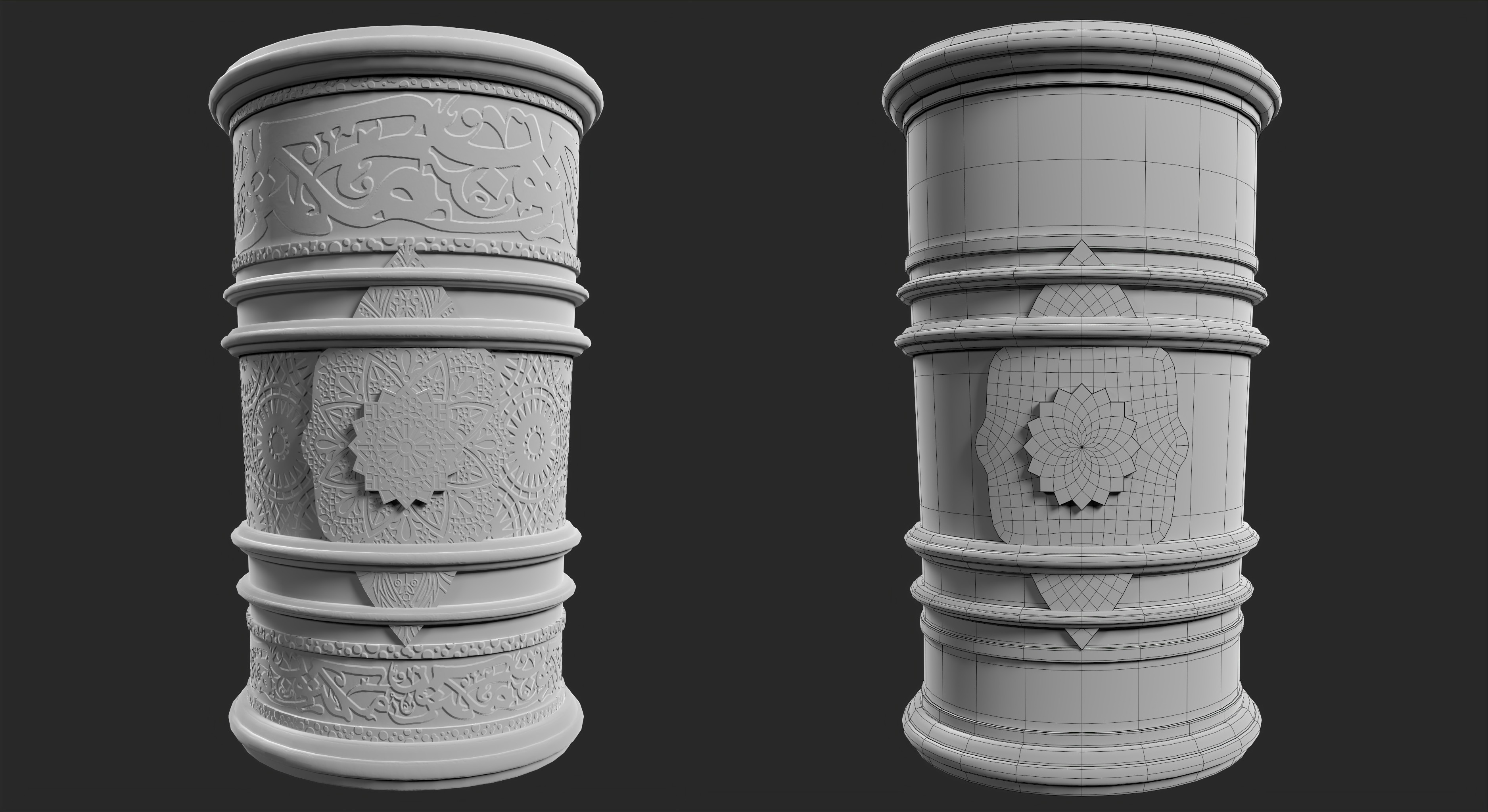 For the pattern detail, I used a mask for most of it, which was quite challenging due to the complexity of the patterns, especially in areas that were identical to the patterns or letters of the Islamic side. Despite the challenges, I'm really proud of this project, but there are still areas that can be improved. Moving forward, I'll continue to work on improving my skills and techniques in modeling and texturing.