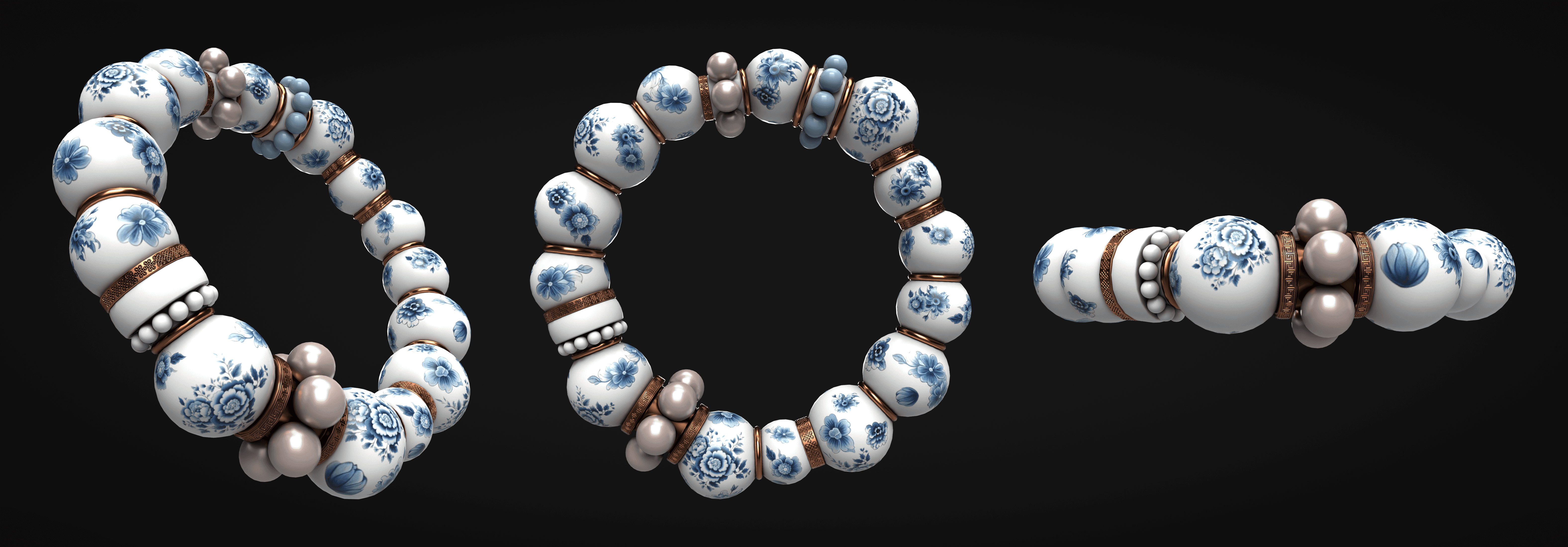 Inspired by my love for porcelain art. I created this porcelain bead bracelet model from basic shapes like spheres and cylinders using Maya. I prepared the porcelain flower and Chinese frame pattern in Photoshop and Illustrator and textured in Substance Painter. Finally, rendered in Marmoset Toolbag 4.